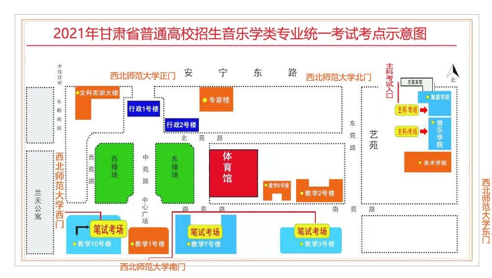 為做好新冠疫情疫情防控工作,確保考生順利入場(chǎng),考生須按照規(guī)定的出入口及路線出入相應(yīng)考點(diǎn)。考生應(yīng)提前在考點(diǎn)門(mén)口排隊(duì),預(yù)留足夠時(shí)間配合考點(diǎn)工作人員進(jìn)行入場(chǎng)核驗(yàn)。具體路線見(jiàn)《2021年甘肅省普通高校招生音樂(lè)學(xué)類(lèi)專(zhuān)業(yè)統(tǒng)一考試考點(diǎn)示意圖》。