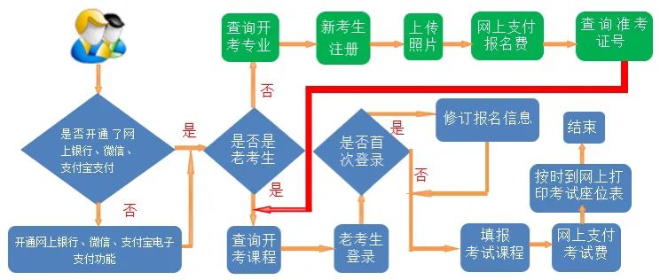 1.新生注冊使用身份證和開通電子支付功能的微信、支付寶、銀行卡直接登錄報名網(wǎng)址進行注冊、報考。