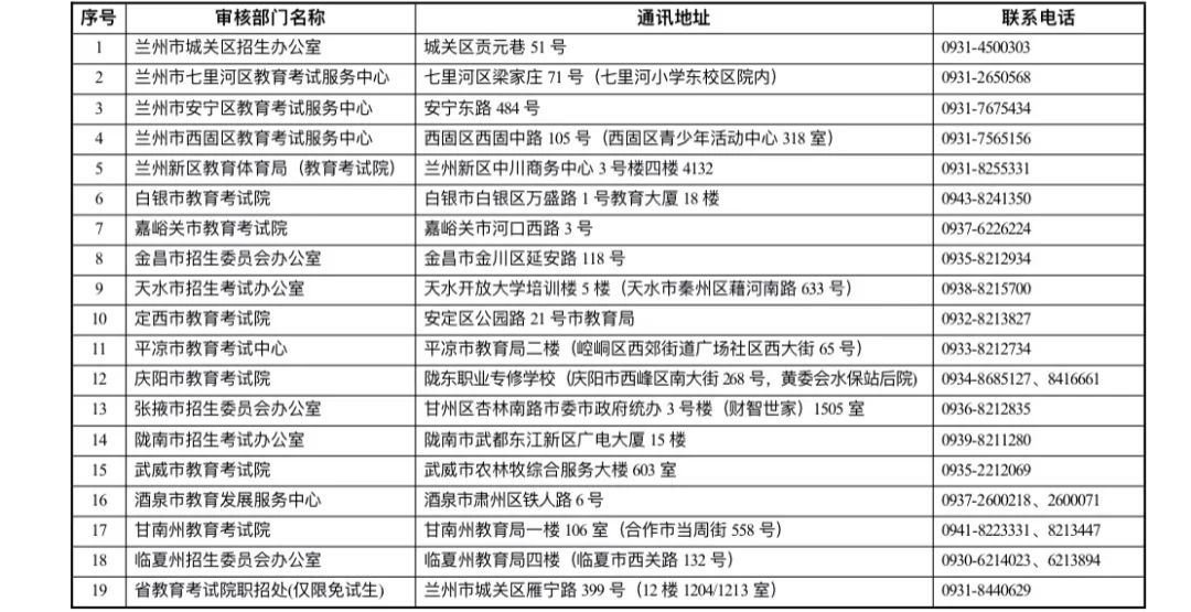 2023年甘肅省成人高校招生網(wǎng)上報名各地審核部門地址及聯(lián)系電話匯總表