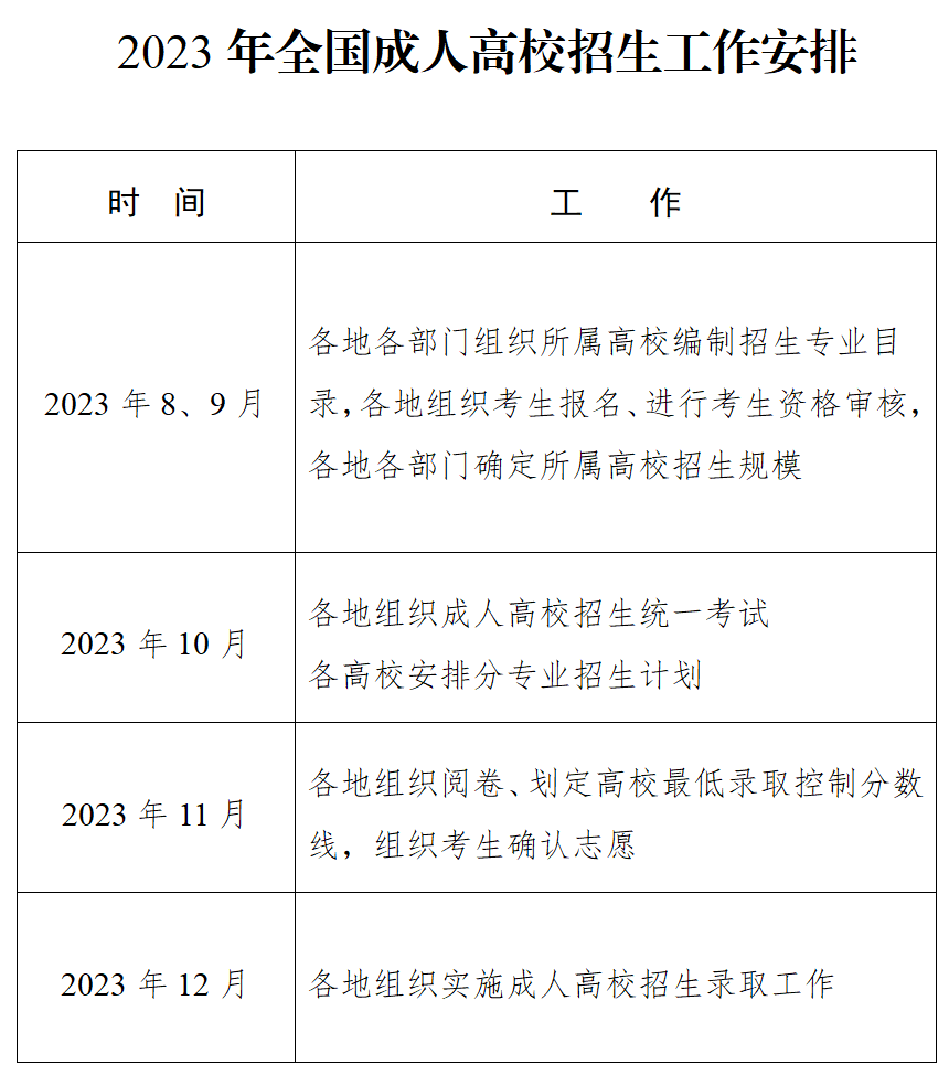 近日,教育部發(fā)布《關(guān)于做好2023年全國成人高校招生工作的通知》,明確2023年全國成人高校招生統(tǒng)一考試于10月21日至22日舉行。具體考試時間是什么時候?如何安排?一起來看——