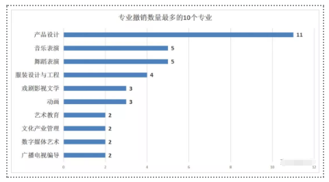 據(jù)統(tǒng)計,11個高校取消產(chǎn)品設(shè)計專業(yè),各有5個高校取消音樂表演和舞蹈表演專業(yè)設(shè)置,具體情況如下圖: