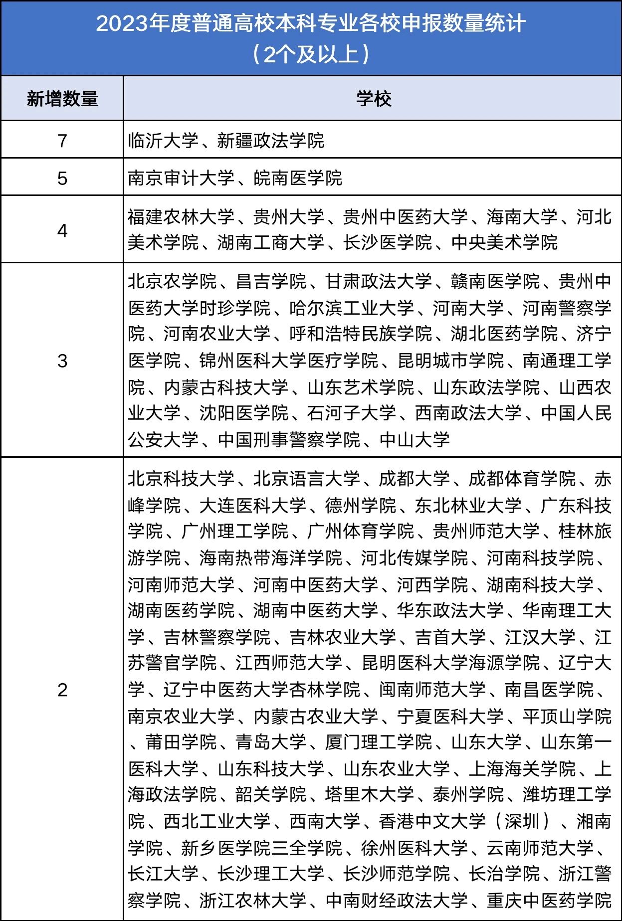 以下是本次申報專業(yè)數(shù)量達(dá)到2個及以上的高校統(tǒng)計
