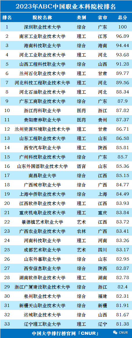 10月20日,2023年ABC中國(guó)職業(yè)本科大學(xué)排名于中國(guó)大學(xué)排行榜官網(wǎng)(CNUR)正式發(fā)布!