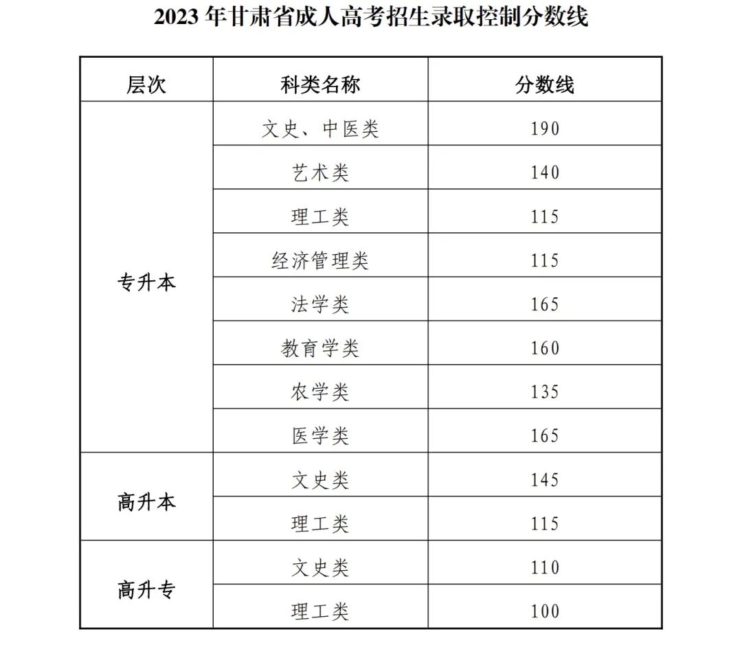 2023 年甘肅省成人高考招生錄取控制分?jǐn)?shù)線