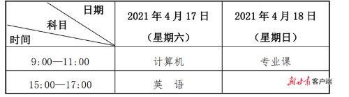 高職(??疲┥究荚嚂r間為4月17日至4月18日,考試科目分為公共課和專業(yè)課,公共課為計算機、英語,每科滿分150分;專業(yè)課滿分為200分。