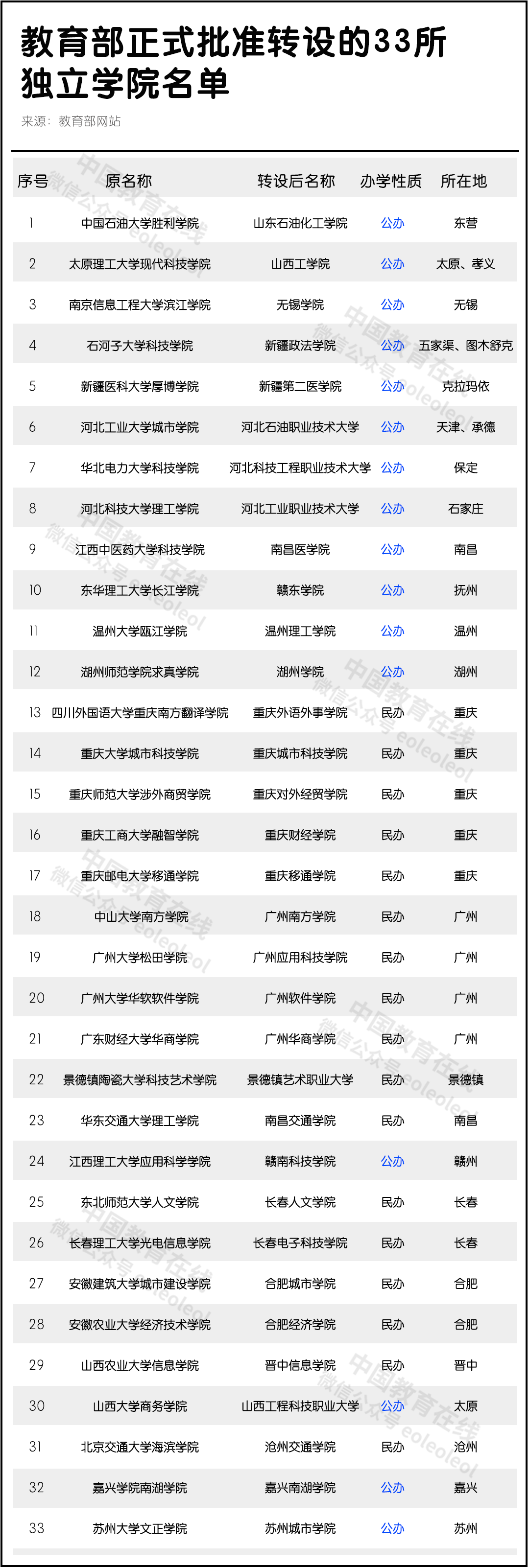 近日,教育部網(wǎng)站公布關(guān)于同意“石河子大學(xué)科技學(xué)院轉(zhuǎn)設(shè)為新疆政法學(xué)院”、“太原理工大學(xué)現(xiàn)代科技學(xué)院轉(zhuǎn)設(shè)為山西工學(xué)院”等獨(dú)立學(xué)院轉(zhuǎn)設(shè)更名回復(fù)函,自2021年1月至2月2日,已有33所獨(dú)立學(xué)院確定更名轉(zhuǎn)設(shè)。