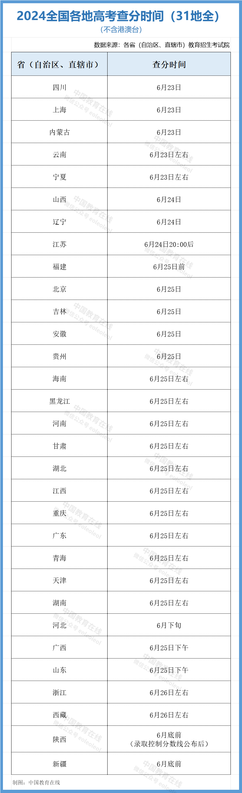 據(jù)全國各省(自治區(qū)、直轄市)教育招生考試院消息,截至目前,全國31個省(直轄市、自治區(qū))[注:不含港澳臺] 都已公布了今年高考成績查詢時間及相關(guān)信息。