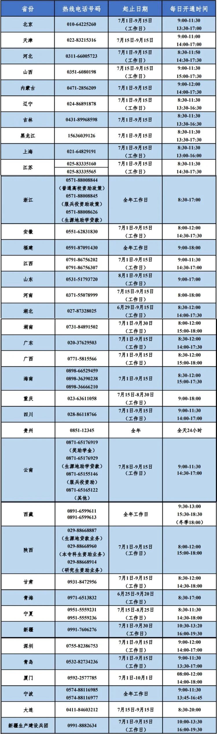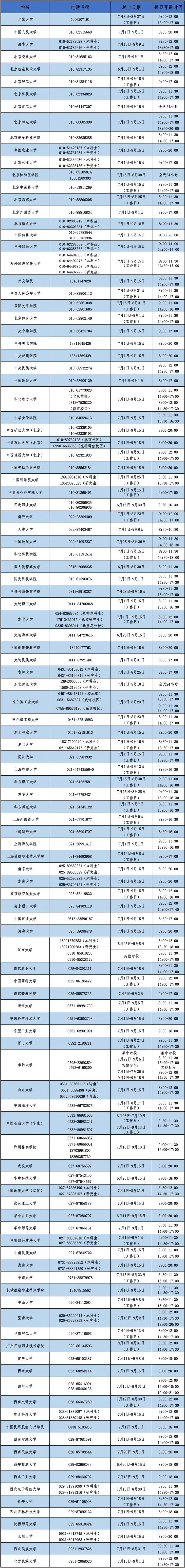 同時,各省(自治區(qū)、直轄市)和中央高校同步開通熱線電話,電話號碼與每日開通時間如下。