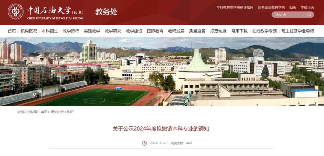 8月20日,中國石油大學(xué)(北京)教務(wù)處發(fā)布《關(guān)于公示2024年度擬撤銷本科專業(yè)的通知》,擬撤銷音樂學(xué)等9個本科專業(yè)。