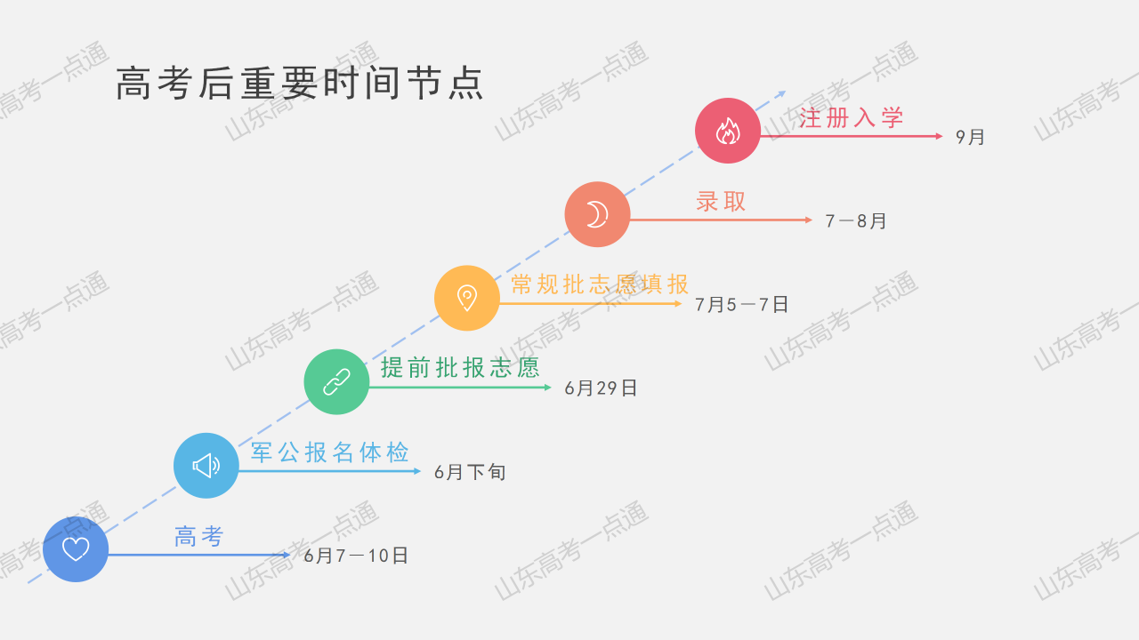 高考之后的重要時(shí)間節(jié)點(diǎn)有,6月7日到10日,按照以往慣例會(huì)在這個(gè)時(shí)間進(jìn)行高考,高考結(jié)束之后,會(huì)進(jìn)行軍事、公安、政法院校的報(bào)名和體檢,基本上是在6月下旬。2024年是6月29日,報(bào)考提前批。7月5日到7日,報(bào)考常規(guī)批的志愿。7月到8月是正常錄取,錄取結(jié)束了,9月會(huì)有注冊(cè)入學(xué),對(duì)于當(dāng)時(shí)沒有被錄取的考生還有最后一次錄取機(jī)會(huì)。這些高考時(shí)間節(jié)點(diǎn)是按照2024年的時(shí)間來舉例的,2025年的高考具體時(shí)間以及相應(yīng)的安排需要以當(dāng)時(shí)的發(fā)布為準(zhǔn)。