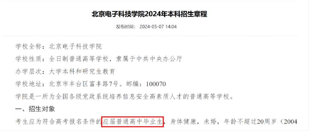 北京電子科技學(xué)院2023年招生章程中首次直接明確表達(dá)只收應(yīng)屆畢業(yè)生,2024年依舊如此,預(yù)計(jì)未來(lái)將持續(xù)只招收應(yīng)屆畢業(yè)生。