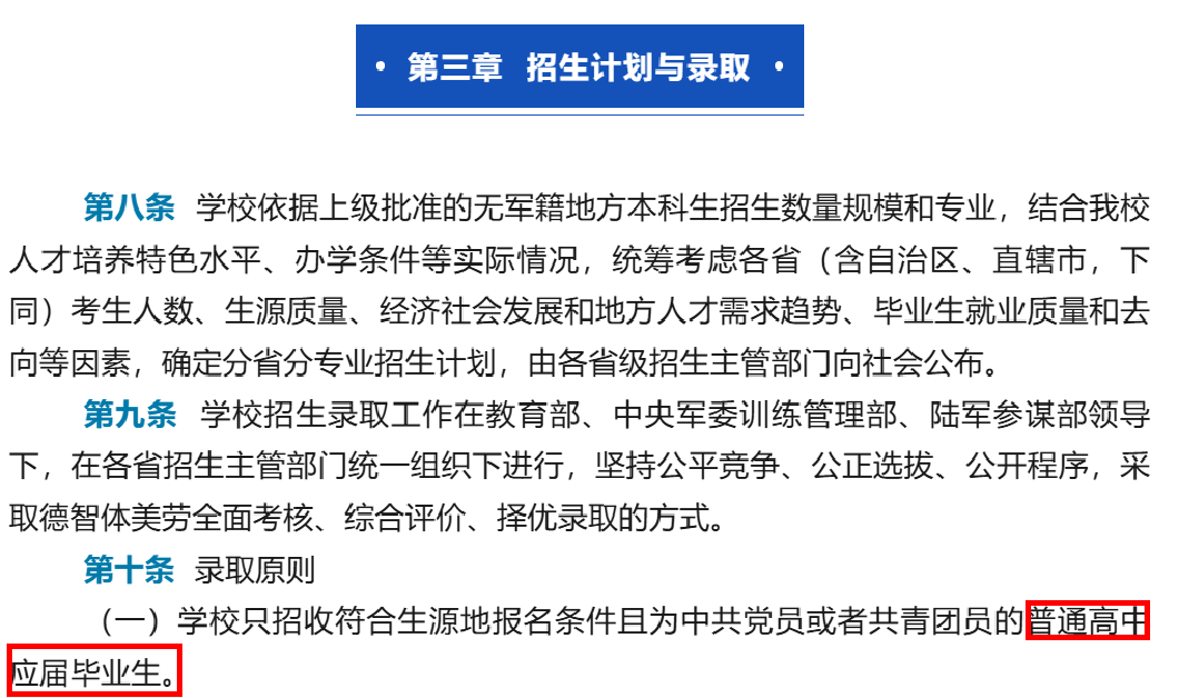 國(guó)防科技大學(xué)2024年招收普通高中畢業(yè)生計(jì)劃(無(wú)軍籍地方本科生)中明確提到:考生須為普通高中應(yīng)屆畢業(yè)生。也就是說(shuō),復(fù)讀生不能報(bào)考。