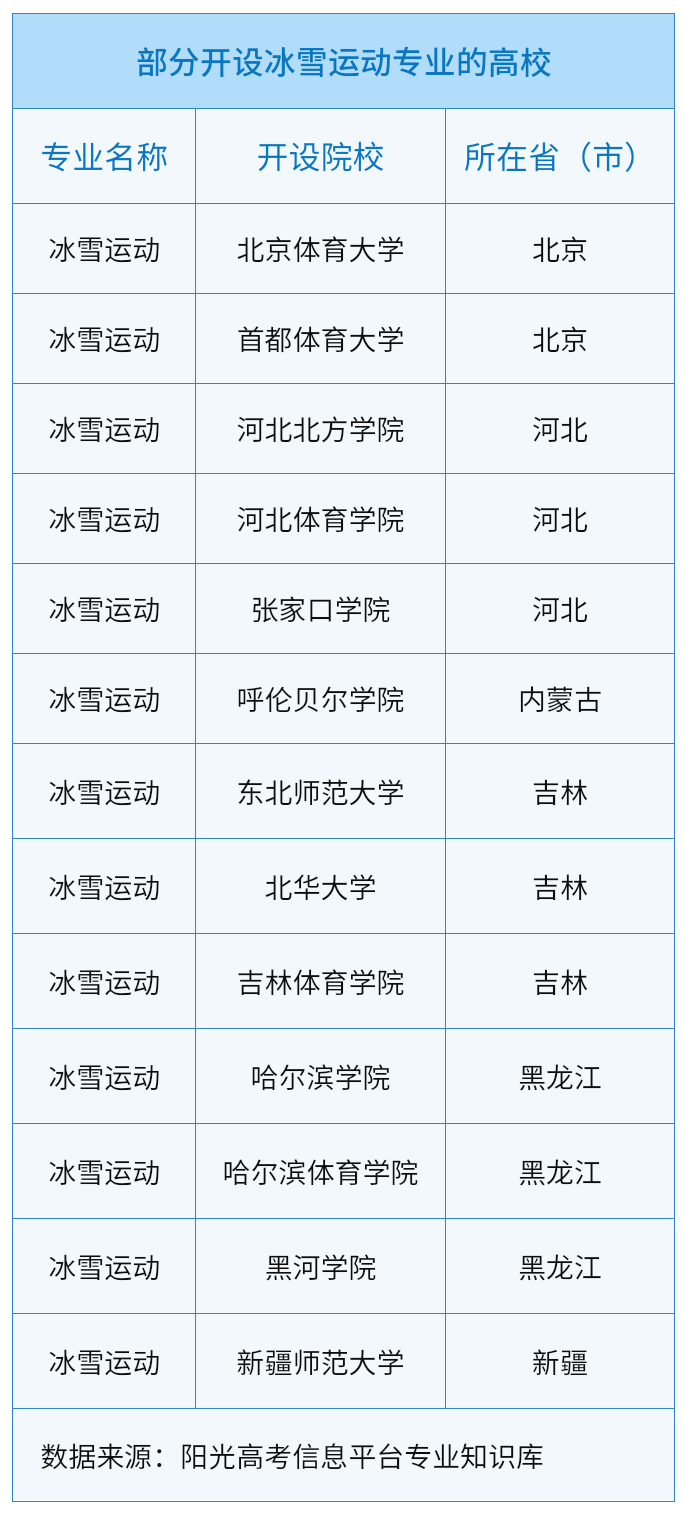 目前,國內(nèi)至少有50所以上的高校開設(shè)有冰雪運動相關(guān)專業(yè)。其中,以體育類大學(xué)居多。