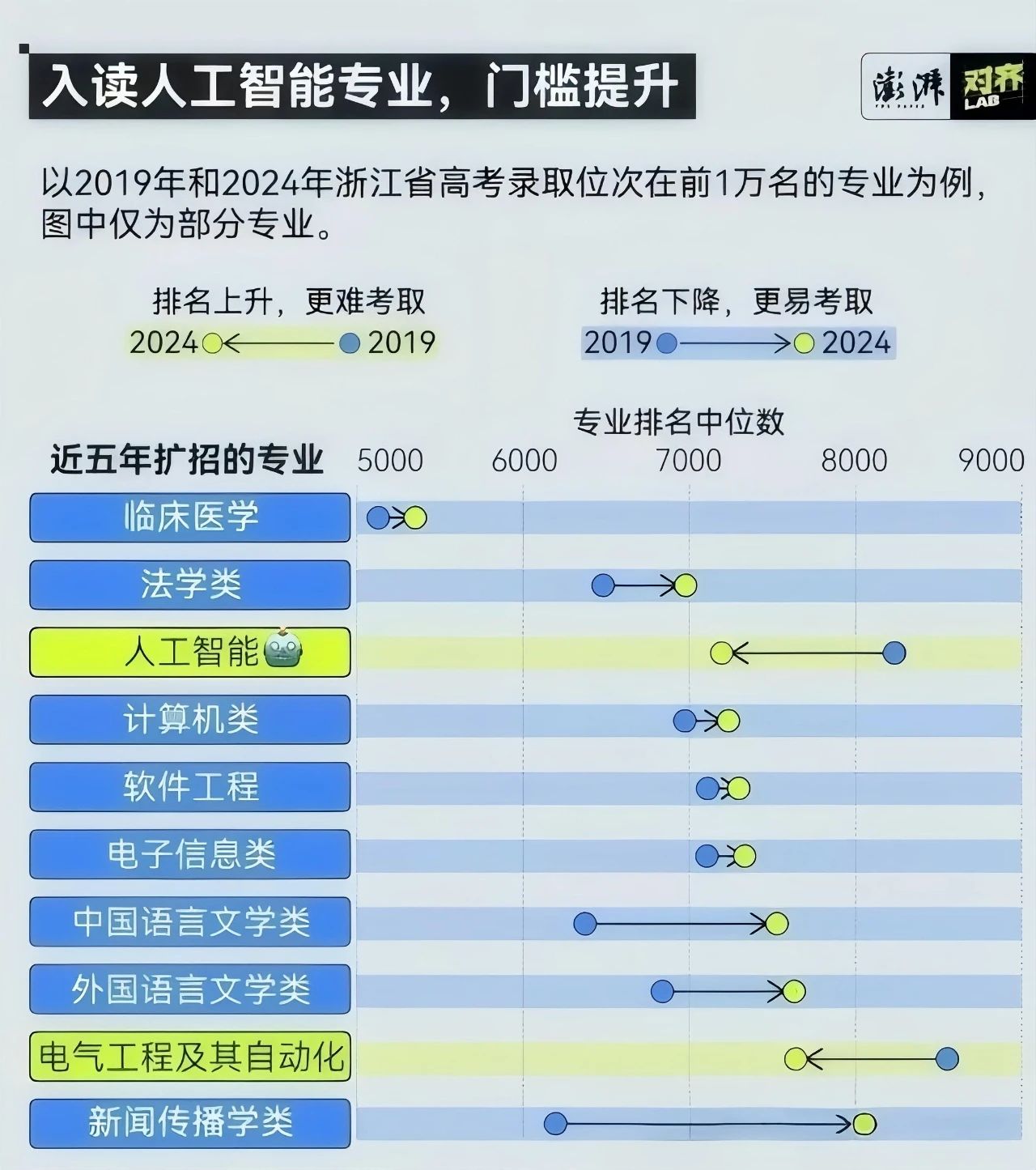 以浙江為例。2019 年,人工智能專業(yè)首次在浙江招生。錄取位次在前1萬名的專業(yè)中,人工智能專業(yè)錄取的排名中位數(shù)在 8235 名。5 年后,人工智能專業(yè)錄取的排名中位數(shù)上升到 7195 名。值得一提的是,這種排名上升,是在人工智能專業(yè)招錄規(guī)模擴(kuò)大的前提之下,這更說明了專業(yè)走俏。