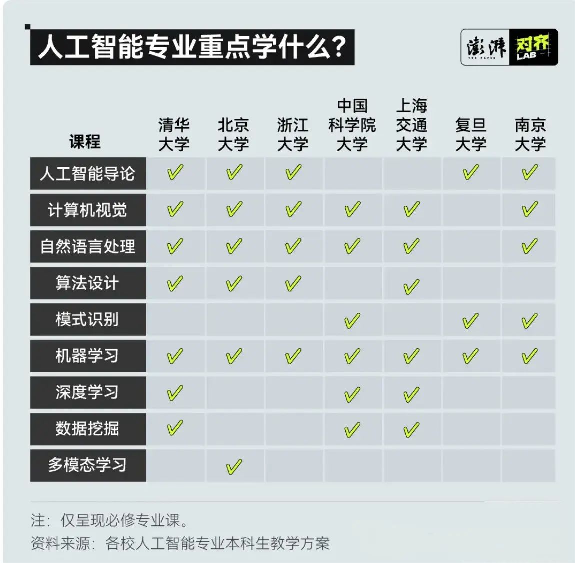 在人工智能專業(yè)必修課方面,上圖整合了清華大學(xué)、北京大學(xué)、浙江大學(xué)等多所高校的人工智能專業(yè)本科的必修課程,可以看到計(jì)算機(jī)視覺、自然語言處理、算法設(shè)計(jì)幾乎在每所高校都有開設(shè)。