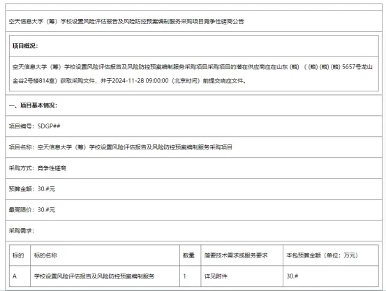 近日,招標網發(fā)布“空天信息大學(籌)學校設置風險評估報告及風險防控預案編制服務采購項目競爭性磋商公告”。