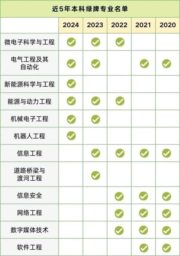 據(jù)《2024年中國本科生就業(yè)報(bào)告》統(tǒng)計(jì),近五年被列為綠牌次數(shù)最多的本科專業(yè)是信息工程、電氣工程及其自動(dòng)化(均為4次),其后是微電子科學(xué)及工程、信息安全、網(wǎng)絡(luò)工程、能源與動(dòng)力工程、數(shù)字媒體技術(shù)(均為3次)等。
