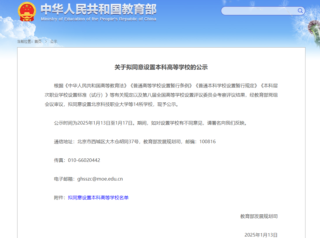 1月13日,教育部發(fā)布關(guān)于擬同意設(shè)置本科高等學(xué)校的公示。根據(jù)《中華人民共和國(guó)高等教育法》《普通高等學(xué)校設(shè)置暫行條例》《普通本科學(xué)校設(shè)置暫行規(guī)定》《本科層次職業(yè)學(xué)校設(shè)置標(biāo)準(zhǔn)(試行)》等有關(guān)規(guī)定以及第八屆全國(guó)高等學(xué)校設(shè)置評(píng)議委員會(huì)考察評(píng)議結(jié)果,經(jīng)教育部黨組會(huì)議審議,