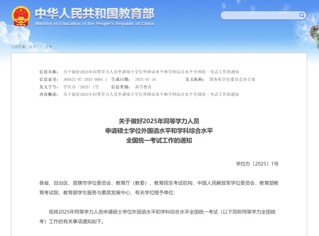 現(xiàn)將2025年同等學(xué)力人員申請(qǐng)碩士學(xué)位外國語水平和學(xué)科綜合水平全國統(tǒng)一考試(以下簡稱同等學(xué)力全國統(tǒng)考)工作的有關(guān)事項(xiàng)通知如下: