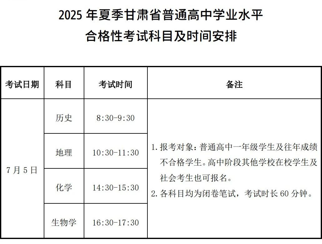 2025年夏季高中學(xué)業(yè)水平合格性考試科目及時(shí)間安排