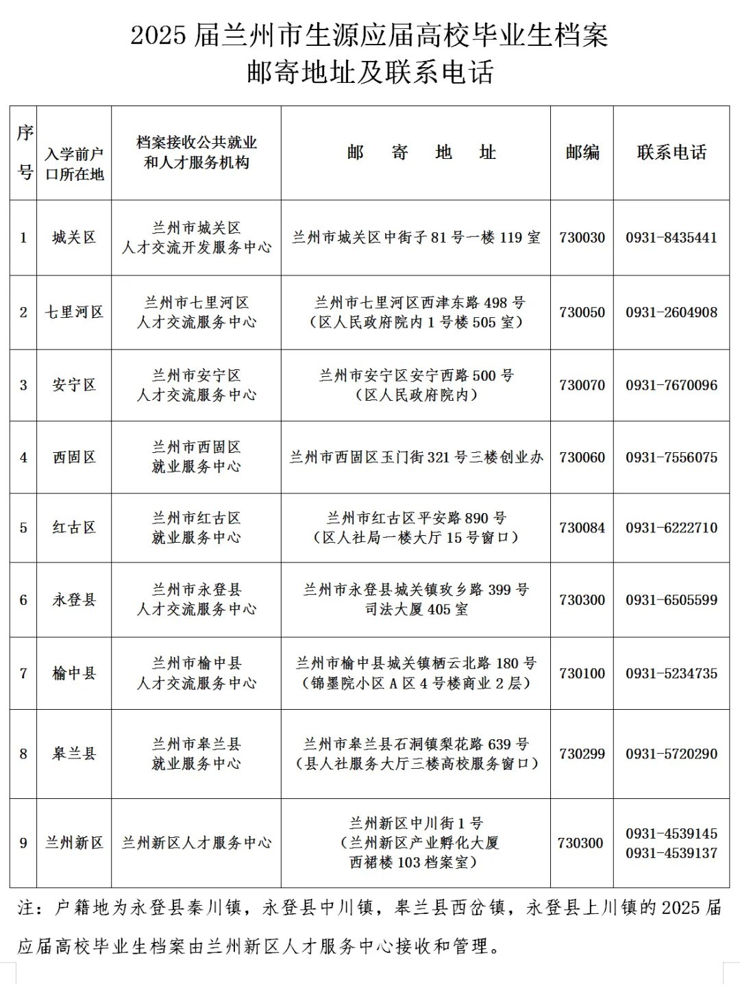 為進(jìn)一步加強(qiáng)高校畢業(yè)生檔案管理,給高校畢業(yè)生提供更加方便快捷的檔案服務(wù),4月15日,蘭州市就業(yè)局公布了2025屆蘭州市生源應(yīng)屆高校畢業(yè)生檔案郵寄地址及聯(lián)系電話。