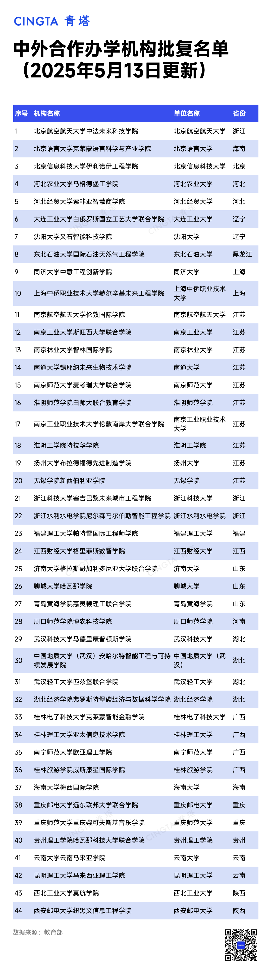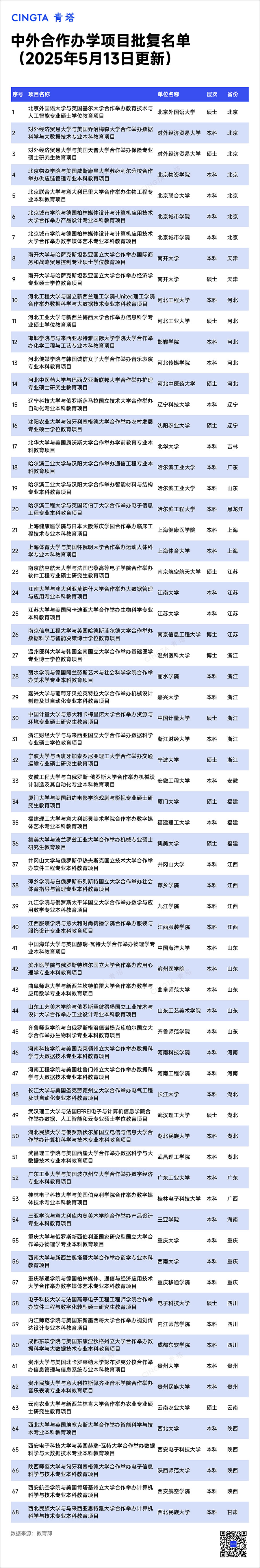 5月13日,教育部中外合作辦學(xué)監(jiān)管工作信息平臺(tái)公布了教育部予以資格認(rèn)定的中外合作辦學(xué)單位。據(jù)統(tǒng)計(jì),此次共有105所高校獲批,其中,