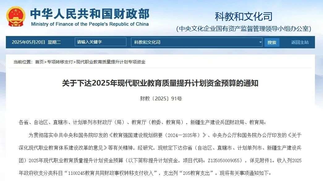 關(guān)于下達(dá)2025年現(xiàn)代職業(yè)教育質(zhì)量提升計(jì)劃資金預(yù)算的通知