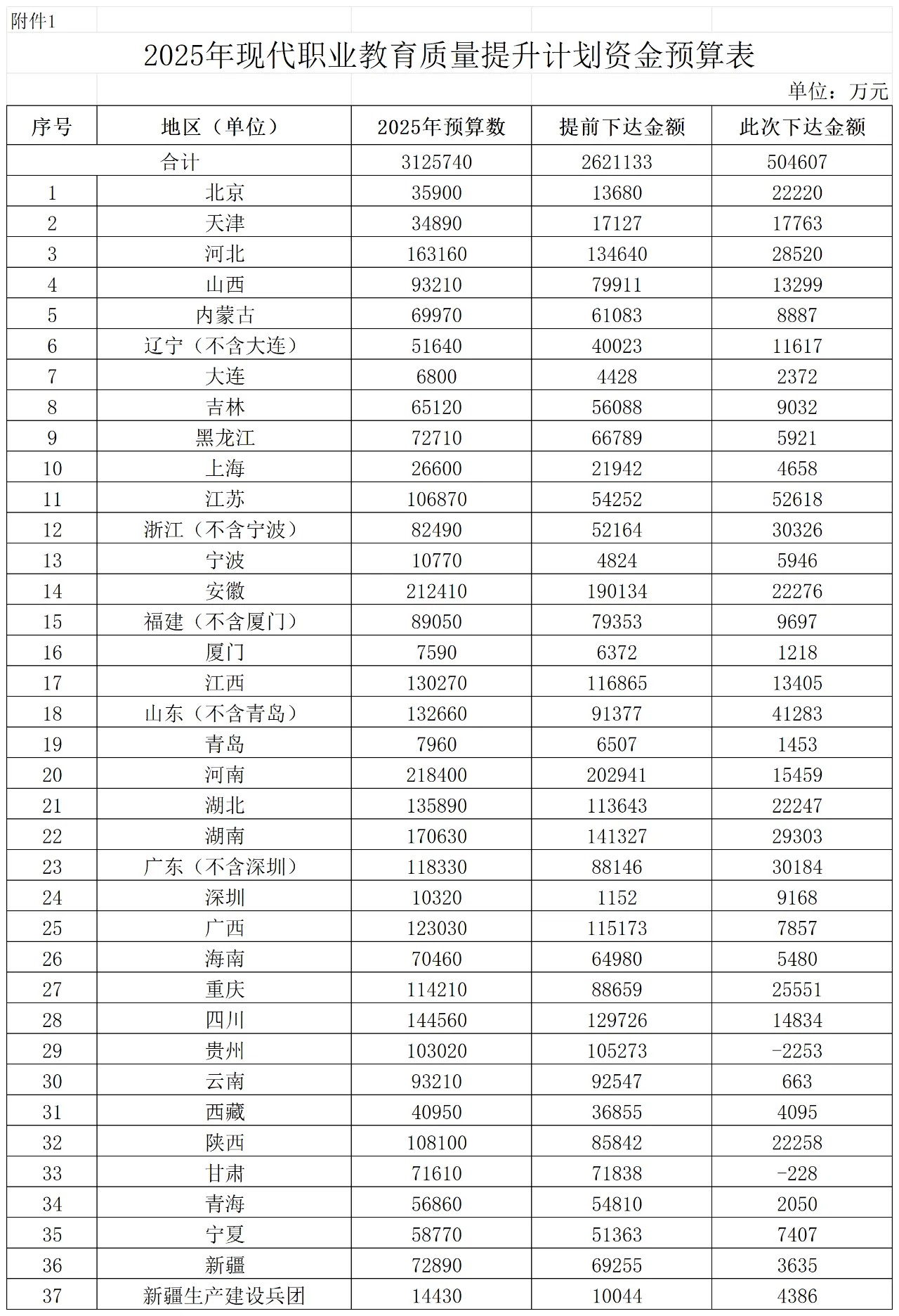 5月19日,財(cái)政部、教育部發(fā)布《關(guān)于下達(dá)2025年現(xiàn)代職業(yè)教育質(zhì)量提升計(jì)劃資金預(yù)算的通知》(下簡稱《通知》)。據(jù)《2025年現(xiàn)代職業(yè)教育質(zhì)量提升計(jì)劃資金預(yù)算表》顯示,2025年預(yù)算數(shù)合計(jì)312.57億元,提前下達(dá)金額262.11億元,此次下達(dá)金額50.46億元。