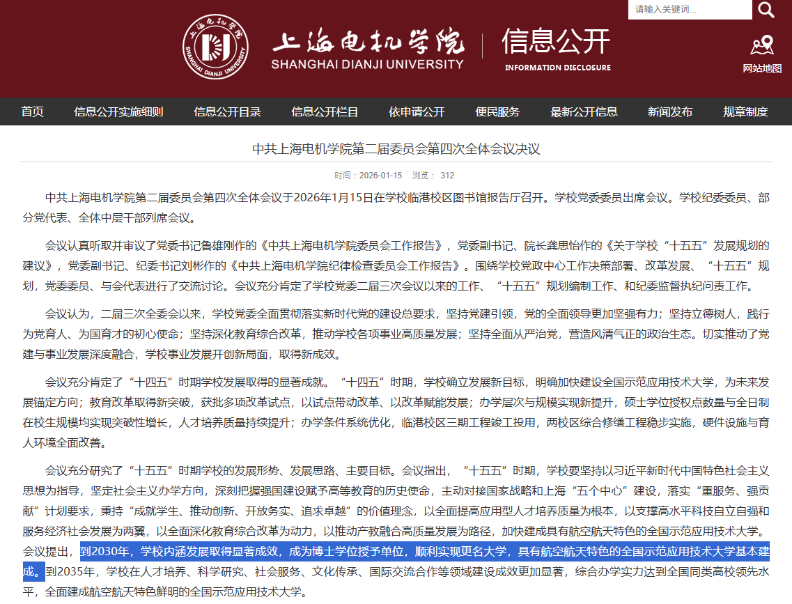 1月15日,上海電機(jī)學(xué)院召開中共上海電機(jī)學(xué)院第二屆委員會(huì)第四次全體會(huì)議。會(huì)議充分研究了“十五五”時(shí)期學(xué)校的發(fā)展形勢(shì)、發(fā)展思路、主要目標(biāo),并提出,到2030年,學(xué)校內(nèi)涵發(fā)展取得顯著成效,成為博士學(xué)位授予單位,順利實(shí)現(xiàn)更名大學(xué),具有航空航天特色的全國(guó)示范應(yīng)用技術(shù)大學(xué)基本建成。到2035年,學(xué)校在人才培養(yǎng)、科學(xué)研究、社會(huì)服務(wù)、文化傳承、國(guó)際交流合作等領(lǐng)域建設(shè)成效更加顯著,綜合辦學(xué)實(shí)力達(dá)到全國(guó)同類高校領(lǐng)先水平,全面建成航空航天特色鮮明的全國(guó)示范應(yīng)用技術(shù)大學(xué)。