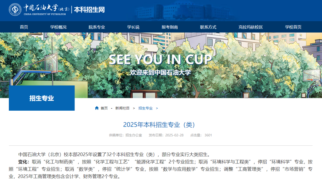 此外,2025年2月,中國石油大學(北京)本科招生網(wǎng)發(fā)布《2025年本科招生專業(yè)(類)》,部分專業(yè)實行大類招生,部分專業(yè)大類招生有新變化:取消“化工與制藥類”,按照“化學工程與工藝”“能源化學工程”2個專業(yè)招生;取消“環(huán)境科學與工程類”,停招“環(huán)境科學”專業(yè),按照“環(huán)境工程”專業(yè)招生;取消“數(shù)學類”,停招“統(tǒng)計學”專業(yè),按照“數(shù)學與應(yīng)用數(shù)學”專業(yè)招生。