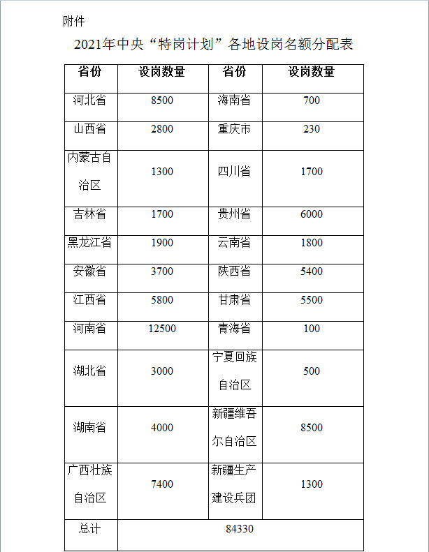 4月6日,教育部辦公廳、財(cái)政部辦公廳發(fā)布《2021年農(nóng)村義務(wù)教育階段學(xué)校教師特設(shè)崗位計(jì)劃實(shí)施工作的通知》(以下簡稱“通知”),2021年全國計(jì)劃招聘特崗教師84330名,其中甘肅省特崗教師招聘5500人,比2020年增加100人。