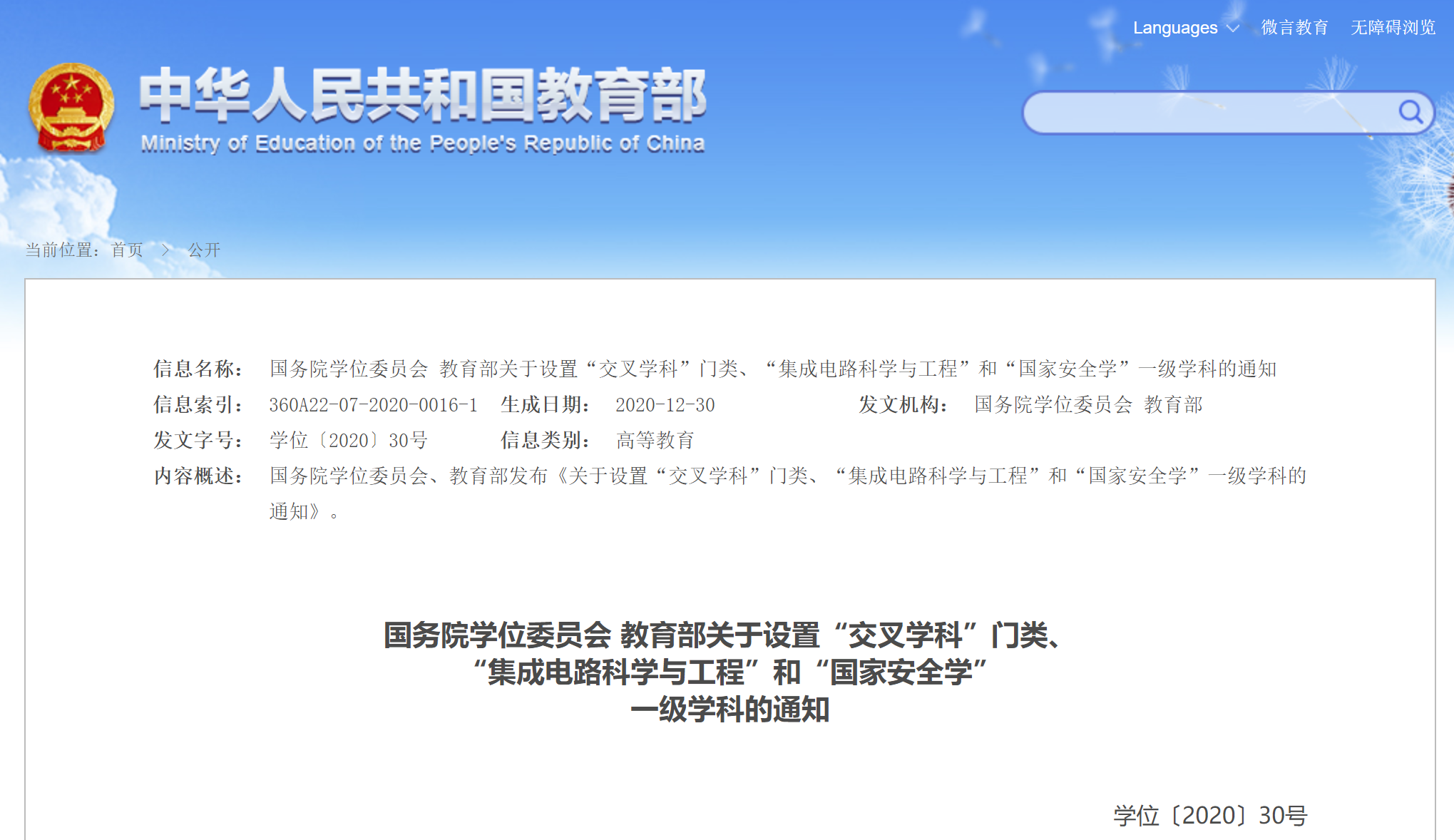 今年1月份,教育部發(fā)布通知,決定設(shè)置“交叉學(xué)科”門類(門類代碼為“14”)、“集成電路科學(xué)與工程”一級學(xué)科和“國家安全學(xué)”一級學(xué)科。