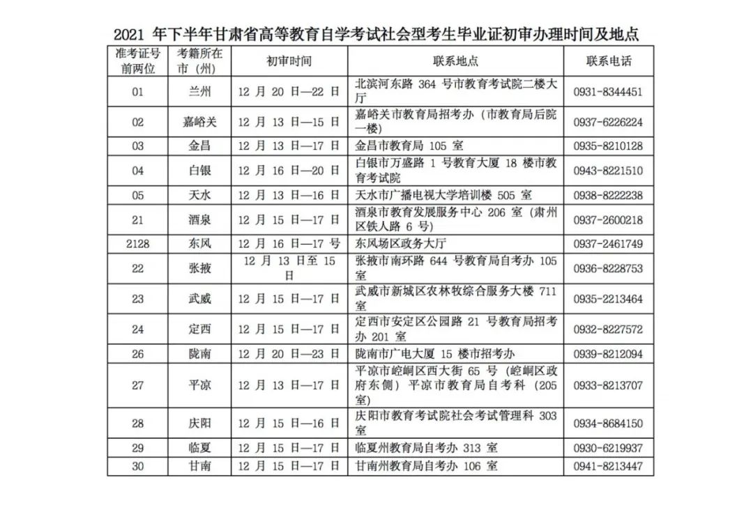 附:2021年下半年甘肅省高等教育自學(xué)考試社會型考生畢業(yè)證初審辦理時間及地點
