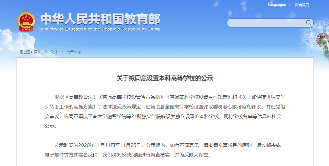11月11日,教育部發(fā)布《關(guān)于擬同意設(shè)置本科高等學(xué)校的公示》,擬同意重慶工商大學(xué)融智學(xué)院等21所獨(dú)立學(xué)院轉(zhuǎn)設(shè)為獨(dú)立設(shè)置的本科學(xué)校,并將學(xué)校名單等信息向社會(huì)公示。