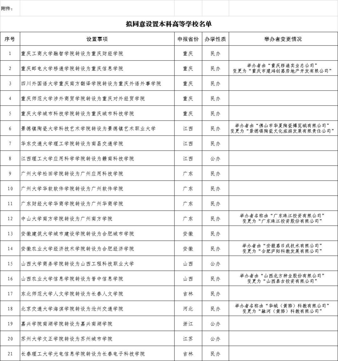 教育部擬同意設(shè)置本科高等學(xué)校名單