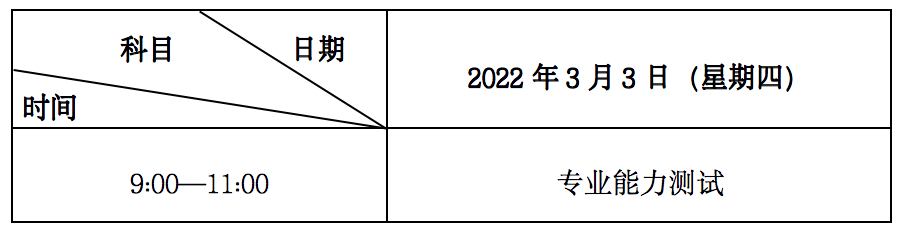 首輪全省統(tǒng)一專業(yè)能力測試時間為2022年3月3日,地點由各招生學校自主確定并通知參加本校專業(yè)能力測試的考生。具體測試時間與測試科目安排如下(北京時間):