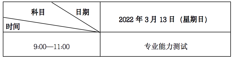 第二輪全省統(tǒng)一專業(yè)能力測試時間為2022年3月13日,地點由各招生學校自主確定并通知參加本校專業(yè)能力測試的考生。具體測試時間與測試科目安排如下(北京時間):