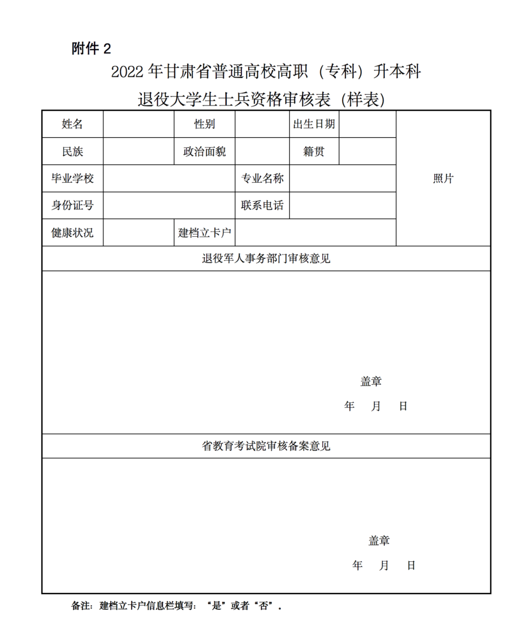 2.2022年甘肅省普通高校高職(??疲┥究仆艘鄞髮W生士兵資格審核表(樣表)