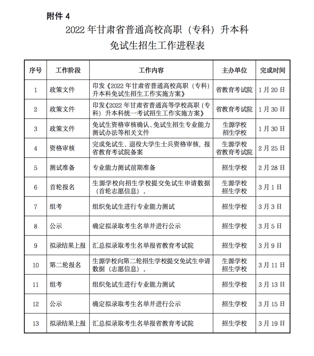 4.2022年甘肅省普通高校高職(專科)升本科免試生招生工作進程表
