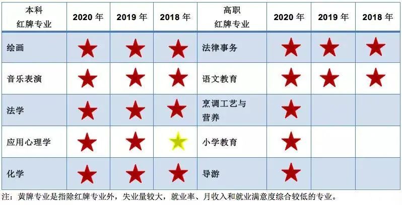 注:紅牌專業(yè)指的是失業(yè)量較大,就業(yè)率、薪資和就業(yè)滿意度綜合較低的專業(yè)。這與相關(guān)專業(yè)畢業(yè)生供需矛盾有關(guān)。紅綠牌專業(yè)反映的是全國(guó)總體情況,各省區(qū)、各高校情況可能會(huì)有差別。