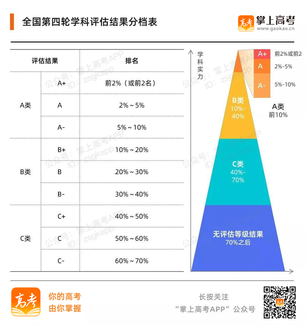 教育部學(xué)科評(píng)估結(jié)果按“分檔”方式呈現(xiàn),將前70%的學(xué)科分9檔公布,其中前2%(或前2名)為A+,2%~5%為A,5%~10%為A-,10%~20%為B+,20%~30%為B,30%~40%為B-,40%~50%為C+,50%~60%為C,60%~70%為C-。排名越高,也就代表學(xué)科實(shí)力越強(qiáng)勁。