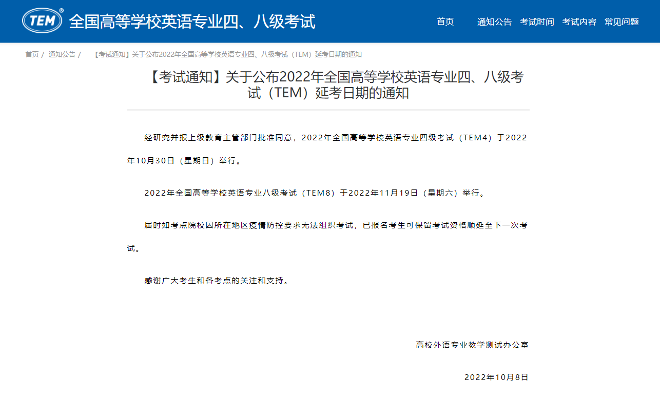 據(jù)高校外語(yǔ)專業(yè)教學(xué)測(cè)試辦公室網(wǎng)站消息,經(jīng)研究并報(bào)上級(jí)教育主管部門批準(zhǔn)同意,2022年全國(guó)高等學(xué)校英語(yǔ)專業(yè)四級(jí)考試(TEM4)于2022年10月30日(星期日)舉行。