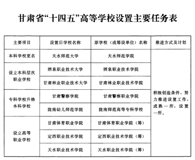 其中規(guī)劃天水師范學(xué)院更名天水師范大學(xué);酒泉職業(yè)技術(shù)學(xué)院、甘肅林業(yè)職業(yè)技術(shù)學(xué)院升格為本科層次的職業(yè)技術(shù)大學(xué);甘肅警察職業(yè)學(xué)院升格本科層次的甘肅警察學(xué)院,隴南師范高等??茖W(xué)校升格為隴南幼兒師范學(xué)院;籌建甘肅體育職業(yè)學(xué)院、定西職業(yè)技術(shù)學(xué)院、天水職業(yè)技術(shù)學(xué)院3所新學(xué)校。