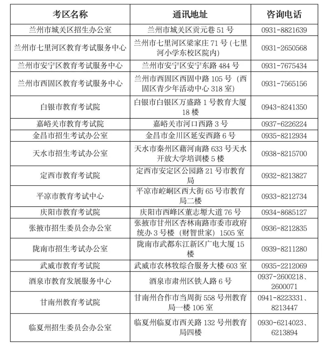 請(qǐng)考生提前做好備考工作,密切關(guān)注甘肅省教育考試院官方網(wǎng)站、官方微信公眾號(hào),及時(shí)了解相關(guān)考試信息,如有疑問(wèn)可咨詢報(bào)考所在地教育考試招生機(jī)構(gòu)(詳見附件)。