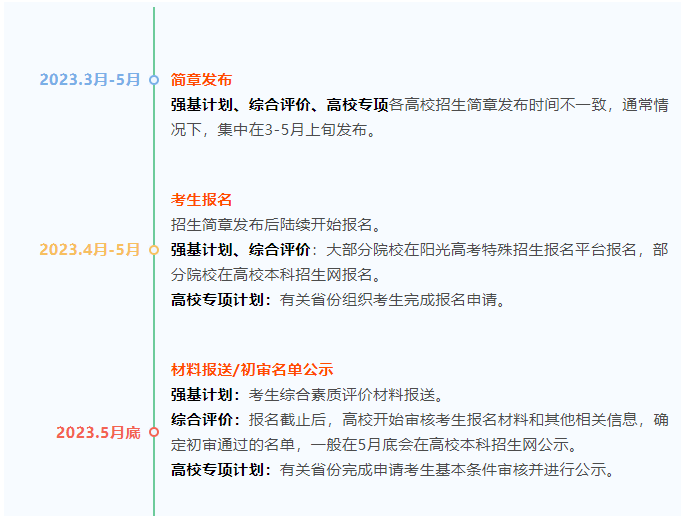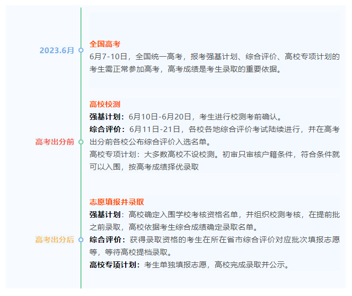 進(jìn)入名校不是只有高考,這幾種降分錄取上名校的路徑,你知道嗎?2023年強(qiáng)基計(jì)劃、綜合評(píng)價(jià)、高校專項(xiàng)這三大特殊類型招生預(yù)計(jì)將于3月份集中啟動(dòng),備考時(shí)間有限,報(bào)名細(xì)節(jié)考生務(wù)必早些了解!現(xiàn)在備考還不晚哦,趕緊和小編一起看看。一、3大特招報(bào)考流程