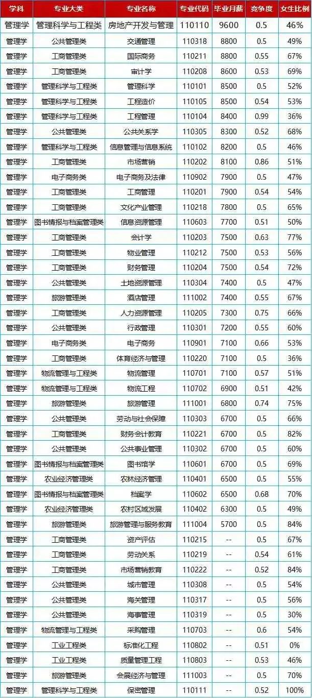 老師是很多家長(zhǎng)喜歡的職業(yè),他們都希望自己的孩子可以有一份穩(wěn)定、有保障的工作,而且老師有寒暑假,因此師范類專業(yè)成為女生報(bào)考的熱門專業(yè)。師范類專業(yè)包括很多,如數(shù)學(xué)、漢語言文學(xué)、英語、日語、學(xué)前教育等。一般而言,護(hù)理學(xué)專業(yè)的女生是特別多的,基本上一個(gè)班級(jí)95%以上都是女生。不僅如此,許多教護(hù)理專業(yè)的老師也大多都是女生。我國(guó)男生當(dāng)護(hù)士的還是比較少見的。據(jù)說有些會(huì)計(jì)專業(yè)的班級(jí)男女比例比護(hù)理學(xué)的還夸張。甚至可以說是一門女生的學(xué)科。過去會(huì)計(jì)專業(yè)非常熱門,但是近幾年會(huì)計(jì)行業(yè)逐漸趨于飽和狀態(tài),但是還是不能阻止家長(zhǎng)和考生對(duì)它的喜愛。小語種近幾年都比較熱門,小語種專業(yè)也是近幾年比較熱門的一個(gè)專業(yè),而且女生學(xué)習(xí)語言類專業(yè),有天生的優(yōu)勢(shì)。如果能力較強(qiáng),還可以到一些中外合資的企業(yè)從事翻譯的工作,工資待遇也比較可觀。全國(guó)普通高校就業(yè)狀況報(bào)告中,畢業(yè)生初次就業(yè)率數(shù)據(jù)統(tǒng)計(jì),德語、法語、西班牙語排名前10位。管理學(xué)也是女生容易扎堆報(bào)考的專業(yè)。女生相對(duì)比較細(xì)心,在決策運(yùn)營(yíng)方面的統(tǒng)籌管理更有優(yōu)勢(shì)一些。像這種所謂的“坐辦公室”的職業(yè),也是家長(zhǎng)比較喜歡的。管理學(xué)包括酒店管理、行政管理、人力資源管理、工商管理、市場(chǎng)營(yíng)銷等。其實(shí)會(huì)計(jì)學(xué)也屬于管理學(xué)大類,但是比較典型,就單獨(dú)拎出來說了。管理學(xué)45個(gè)專業(yè)畢業(yè)生薪酬一覽: