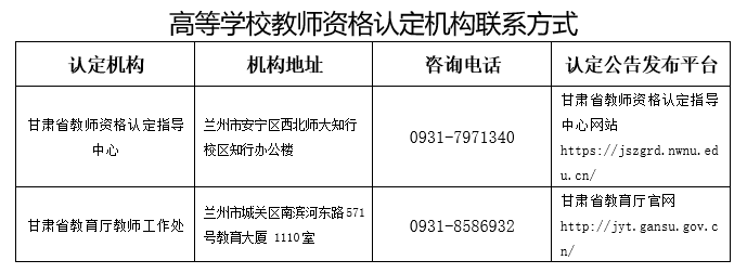 2.高等學(xué)校教師資格認(rèn)定網(wǎng)報(bào)時(shí)間:具體以甘肅省教師資格認(rèn)定指導(dǎo)中心通知公告為準(zhǔn)。