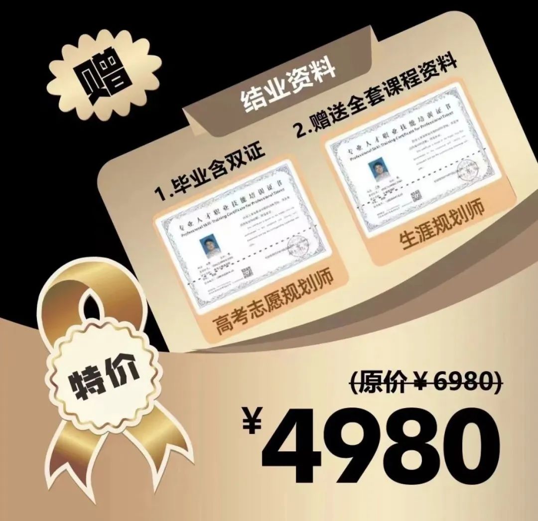 在另一家機構(gòu),高考志愿填報師認證班更為“高效”?!?strong>每月都會有一期,對專業(yè)和學歷沒要求。”從工作人員發(fā)來的培訓安排來看,內(nèi)容不僅包括新高考改革、高考志愿填報規(guī)則,還涉及咨詢服務全流程和溝通技巧。如此海量的信息,全部壓縮在短短兩天之內(nèi)完成。“畢業(yè)含雙證,分別是高考志愿規(guī)劃師和生涯規(guī)劃師,原價6980元,特價只要4980元?!?/p>