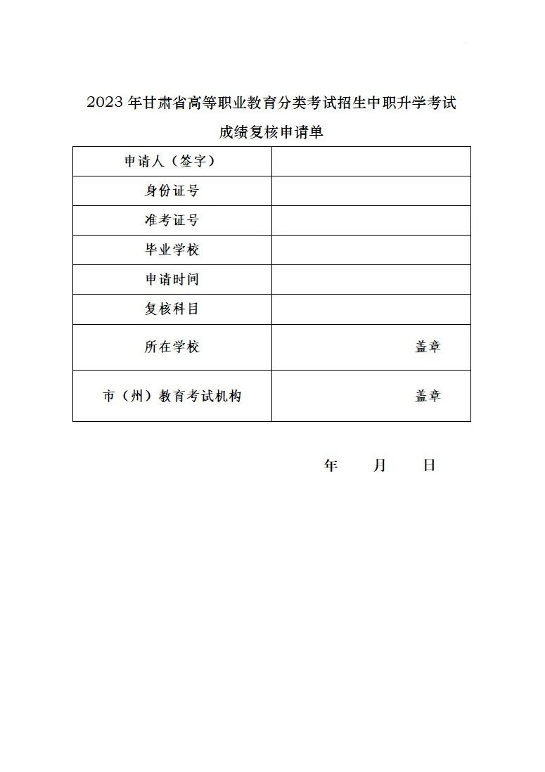 附件:2023年甘肅省高等職業(yè)教育分類(lèi)考試招生中職升學(xué)考試成績(jī)復(fù)核申請(qǐng)單