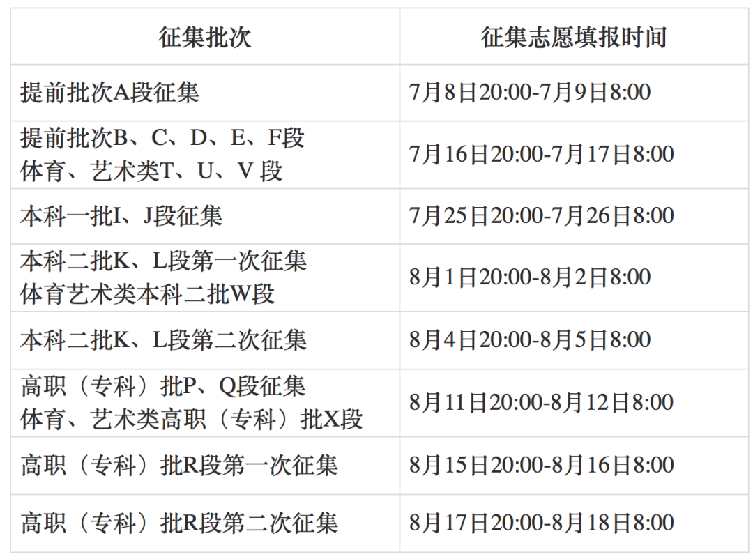 本科提前批A段、B段、C段、D段、E段、F段、G段,本科一批H段、I段、J段,本科二批K段、L段,高職(專科)批P段、Q段,體育、藝術(shù)類本科一批(T段、U段、V段),體育、藝術(shù)類本科二批(W段)。